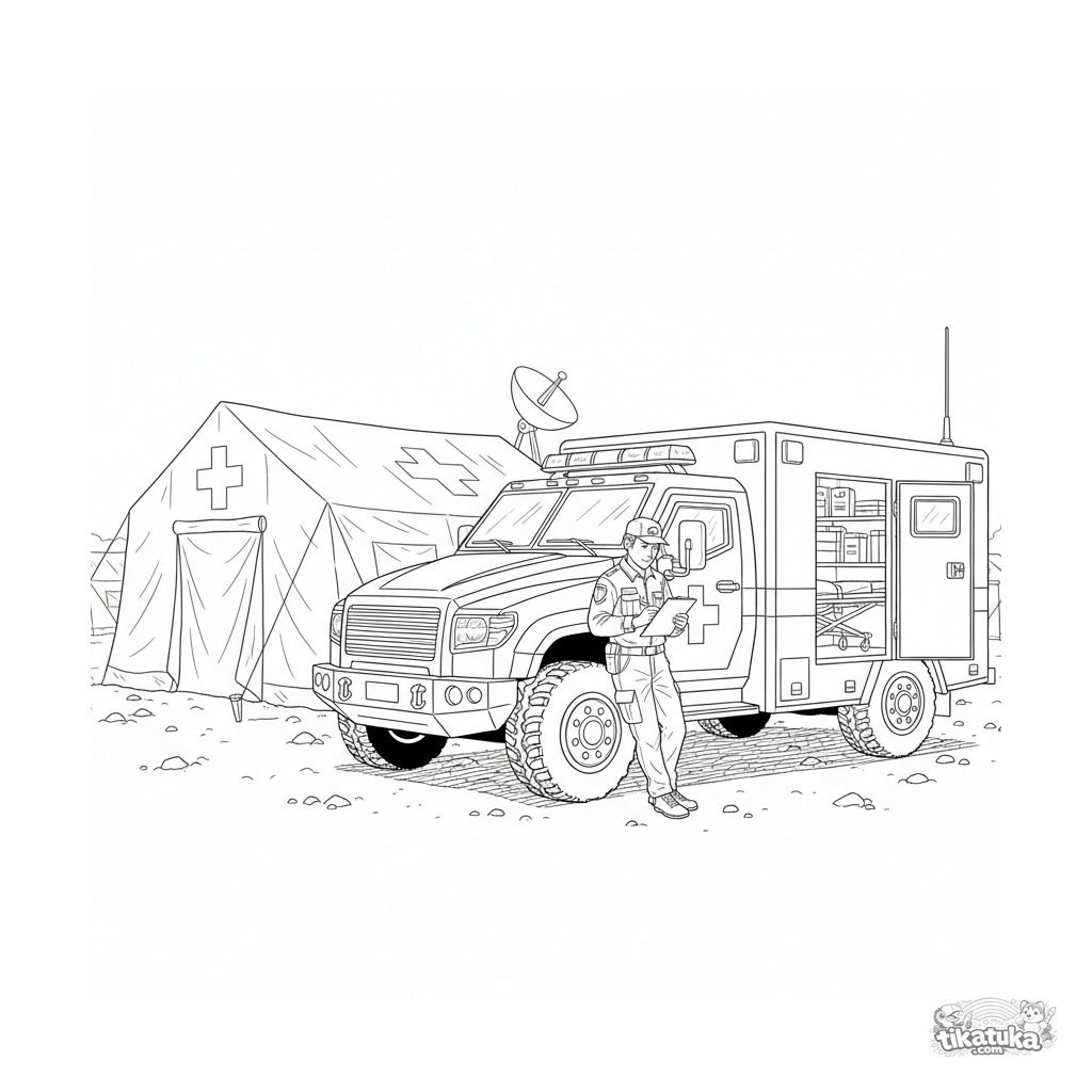 Detailliertes Ausmalbild für 10-12 Jahre: Ein moderner gepanzerter Krankenwagen, der am Sanitätszelt eines Feldhauptquartiers parkt.