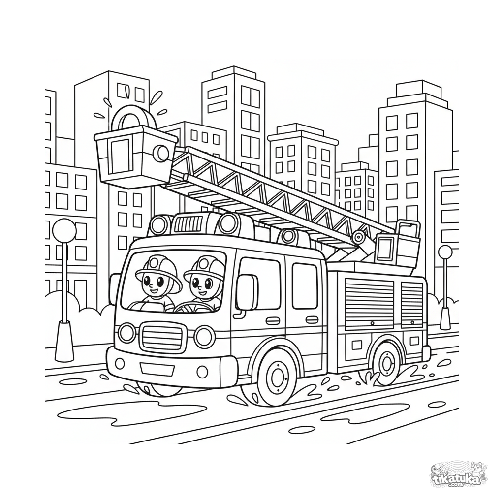 Ausmalbild für Jungen: ein modernes Feuerwehrauto mit Blinklicht und Sirene rast eine nasse Straße entlang. Feuerwehrleute im Führerhaus.