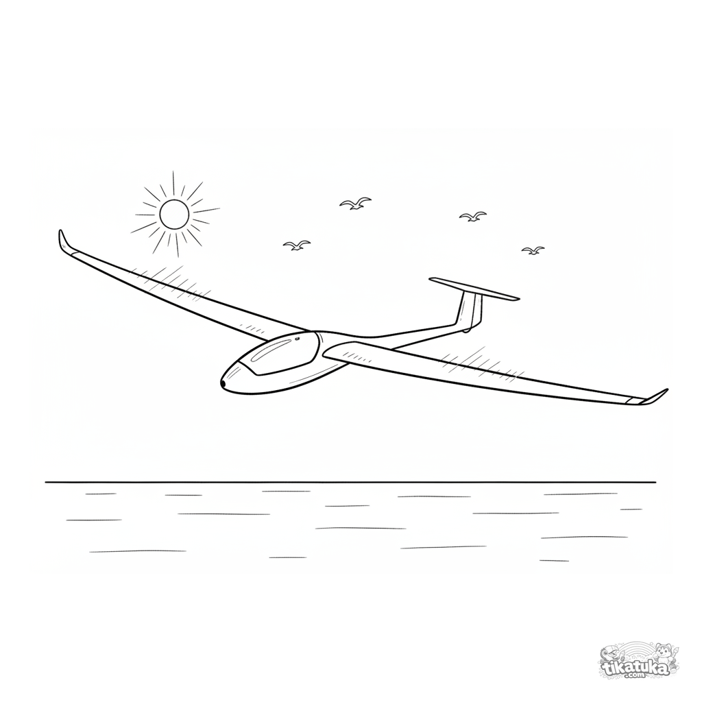 Ausmalbild für Kinder 4-6: Ein anmutiger moderner Segelflieger gleitet über den Ozeanhorizont. Saubere Linien, Aquarell-Skizzen-Stil.
