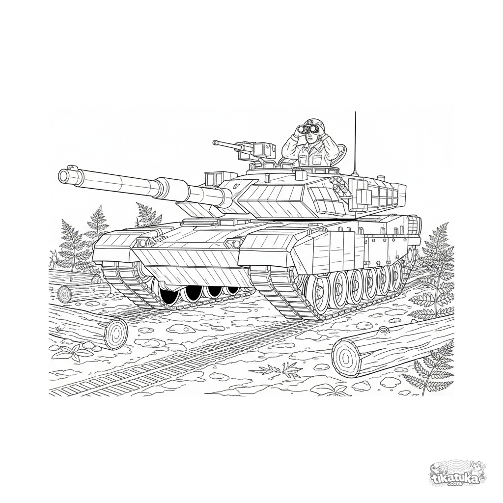 Detailliertes Militärfahrzeug-Ausmalbild für Jungen von 7-12 Jahren. Ein moderner Kampfpanzer mit Tarnnetz steht auf einer Waldlichtung.