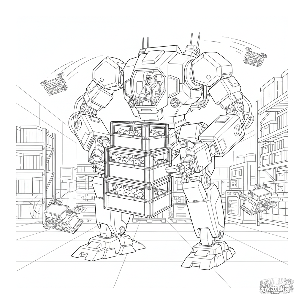 Detailliertes Ausmalbild für 10-12 Jahre: Ein komplexer modularer Mech-Lader mit Hydraulikarmen hebt Kisten in einem Lagerhaus. Technischer Blueprint-Stil.
