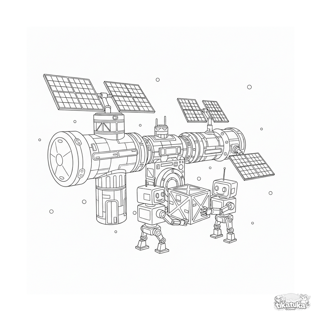 Ausmalbild für 10-12 Jahre: Eine detaillierte modulare Raumstation im Weltall, mit Robotern, die Andockmanöver durchführen. Technischer Blaupausen-Stil.