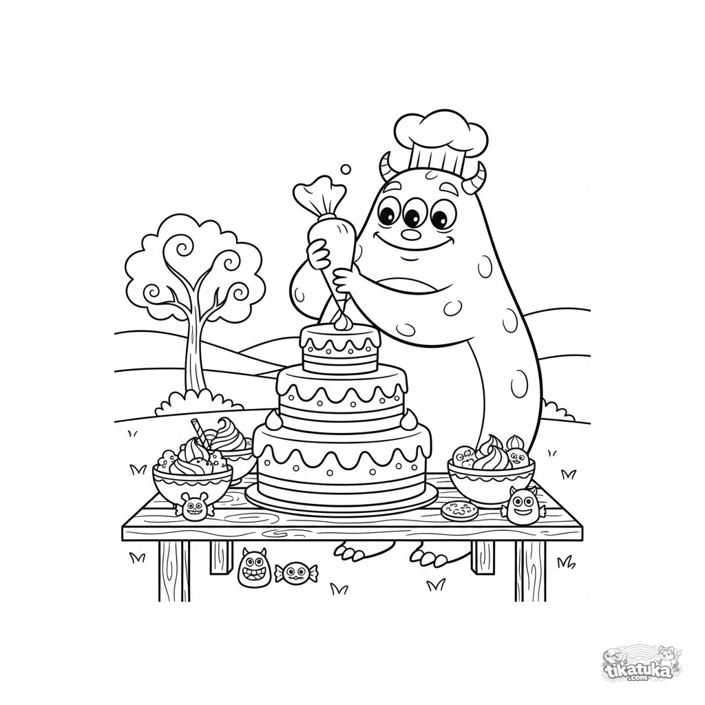 Ausmalbild für Tweens von 7-9 Jahren: ein Monster mit Kochmütze verziert einen großen Kuchen auf einem Picknicktisch. Viele Details: Zuckerguss, Streusel, Süßigkeitenkorb.
