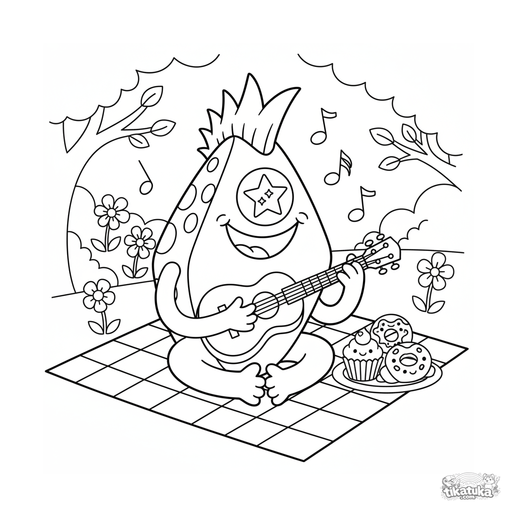 Ausmalbild für Kinder 7-9 Jahre im 80er-Cartoon-Stil: ein fröhliches Monster spielt Ukulele auf einem Picknick.