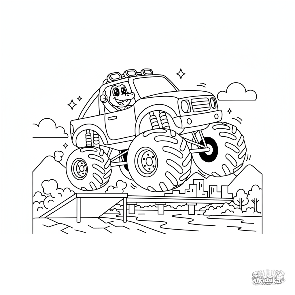 Ausmalbild für Kinder 4-6: Ein riesiger Monster Truck springt von einer Rampe auf einer Brücke. Lustige, dynamische Actionszene für Jungen.