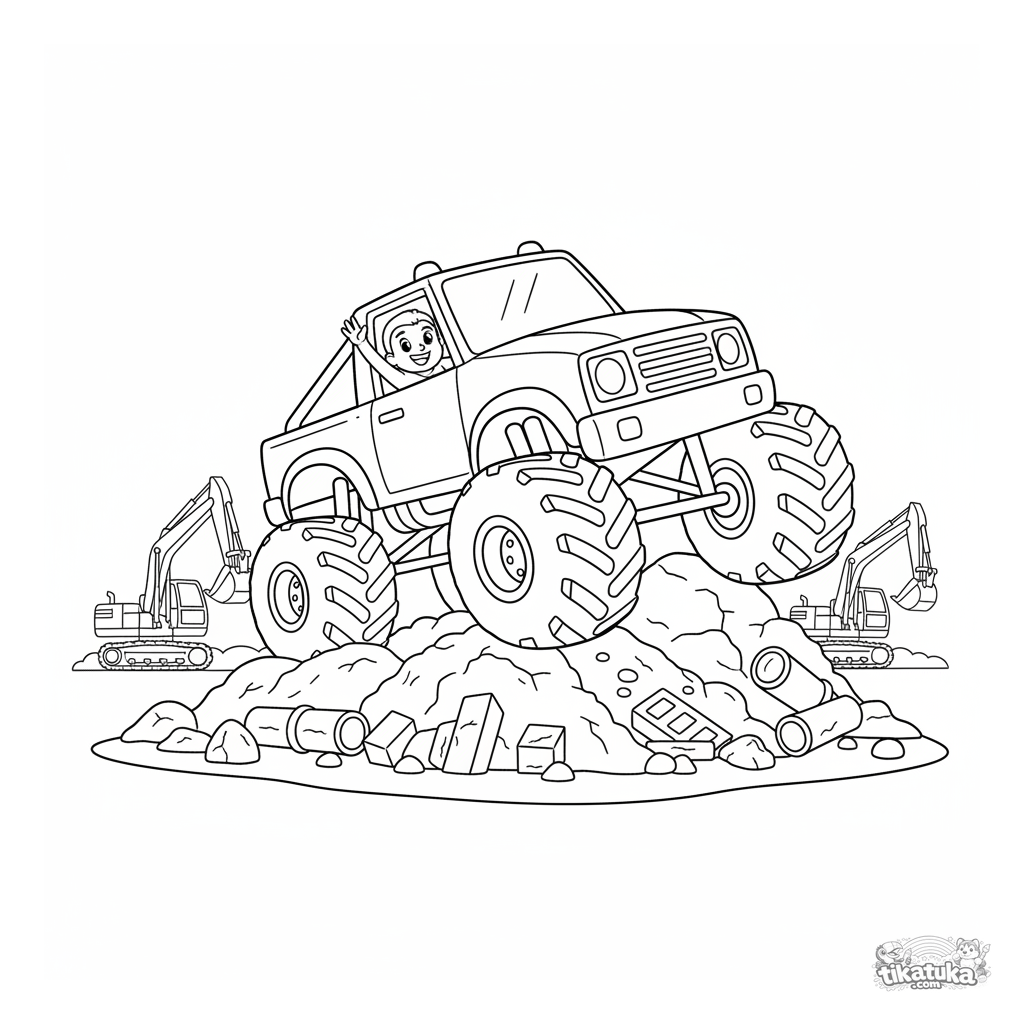 Ausmalbild für Jungen: ein kräftiger Monster Truck bezwingt einen Erdhaufen auf einer Baustelle. Für Kinder im Alter von 4-6 Jahren.
