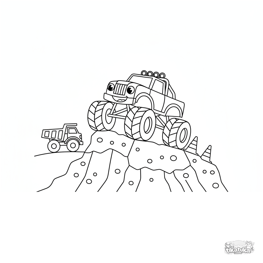Ausmalbild für Jungen: ein kräftiger Monster Truck erklimmt einen Erdhügel. Dynamische Szene mit großen Rädern.