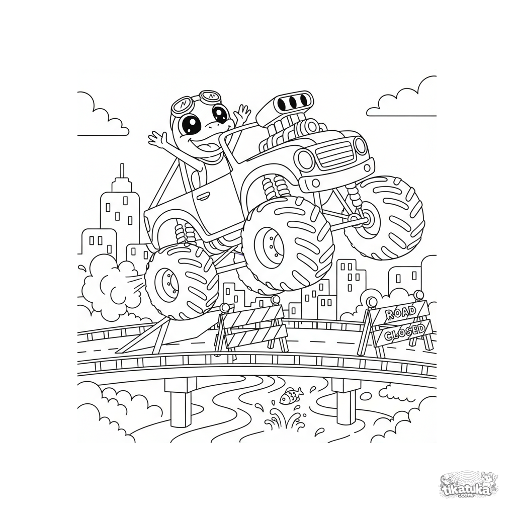 Ausmalbild für Tweens 7-9: Ein riesiger Monster Truck springt von einer Rampe auf einer Stadtbrücke über einen Fluss. Der Echsenfahrer jubelt. Dynamische Komposition, mittlere Detailstufe.