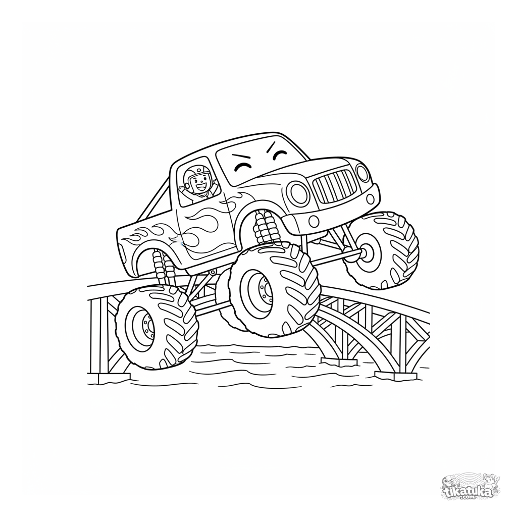 Ausmalbild für Jungen von 4-6 Jahren: Ein riesiger Monster-Truck führt einen Stunt auf einer Brücke über einem Fluss aus. Dynamische Pose, klare Umrisse, ausdrucksstarkes 80er-Jahre-Design.