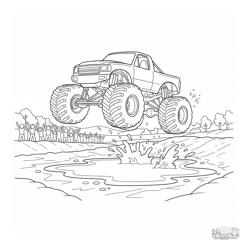Ausmalbild für Jungen 4-6: Ein cooler Monster Truck mit riesigen Rädern springt über eine spritzende Schlammlache auf einer Schotterpiste. Energische, detaillierte Szene.