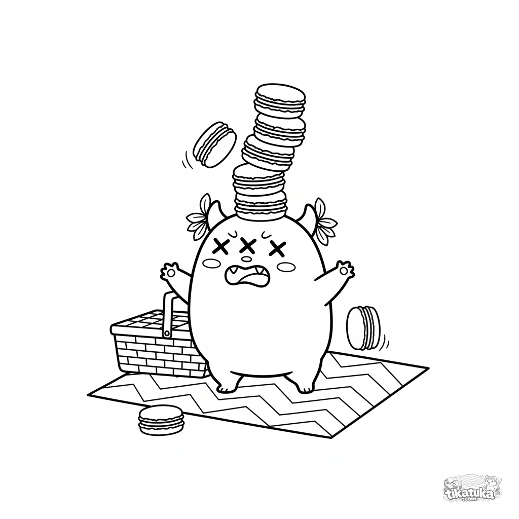 Ausmalbild für Kinder 7-9: Ein lustiges Monster mit X-förmigen Augen versucht, einen fallenden Makronen-Turm auf einem Picknick zu balancieren. Dynamische, humorvolle Szene.