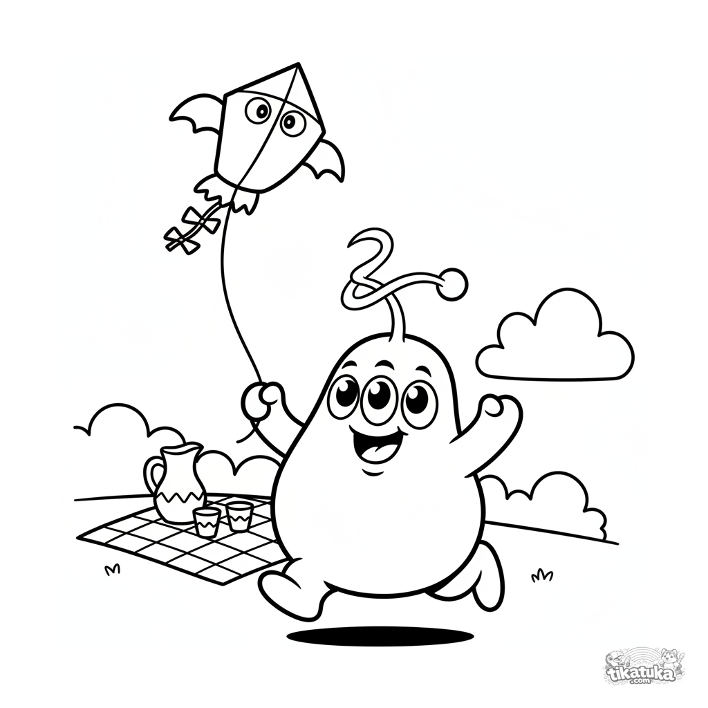 Ausmalbild eines energischen Monsters, das auf einem Picknick einen Drachen steigen lässt. Für Kinder von 7-9 Jahren. Dynamische Pose, Details von Feld und Picknick.