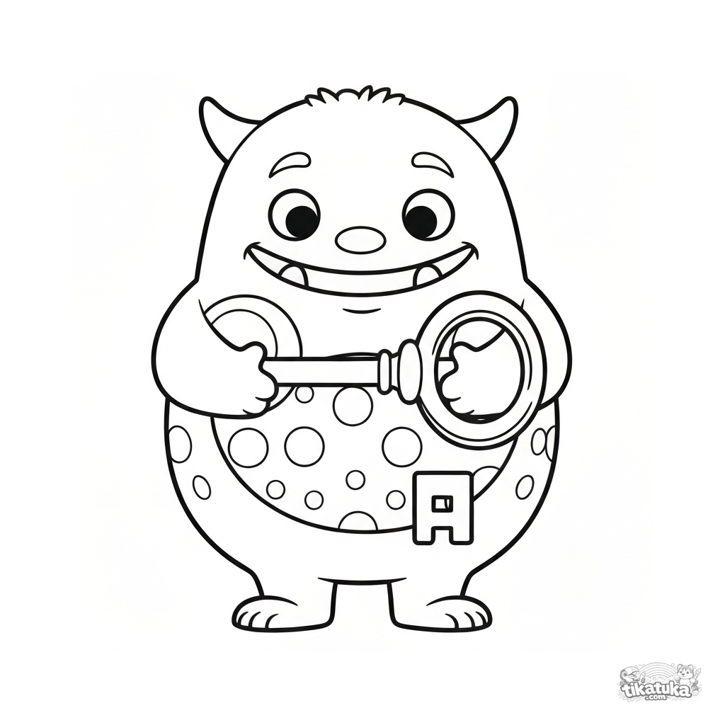 Ausmalbild für Kinder 2-4 Jahre. Ein pummeliges Monster mit Punktebauch hält einen großen altmodischen Schlüssel in beiden Händen. Einfaches Design mit breiten Rändern. Kostenlos herunterladen.