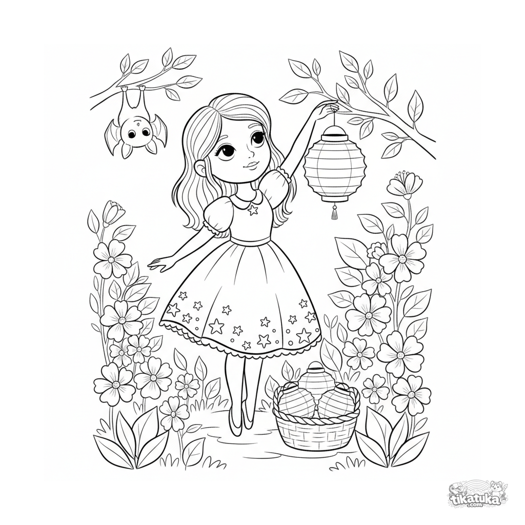 Ausmalbild für Kinder 4-6: Eine Mondprinzessin hängt Papierlaternen in einem nachtblühenden Garten auf. Sternenkleid, Blumen, eine freundliche Fledermaus.