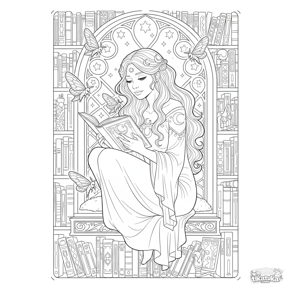 Detailliertes Ausmalbild für Kinder 10-12: Eine Mond-Prinzessin in einem silbrigen Kleid liest einem leuchtenden Motten ein Märchenbuch in einer gemütlichen Ecke einer alten Bibliothek bei Nacht vor.