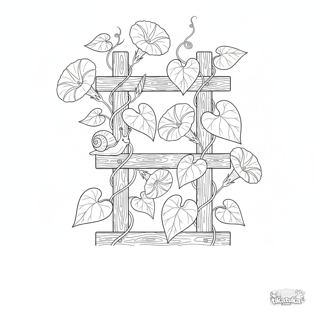 Detailliertes Ausmalbild für 10-12 Jahre: Eine blühende Prunkwinde mit herzförmigen Blättern erklimmt ein Holzgartengitter, eine Schnecke ist in der Nähe.