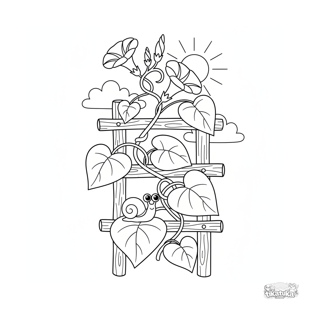 Ausmalbild für Kinder 4-6: Eine rankende Prunkwinde mit Trompetenblüten an einer Gartenrankhilfe. Klare Silhouetten und ausgewogene Details.
