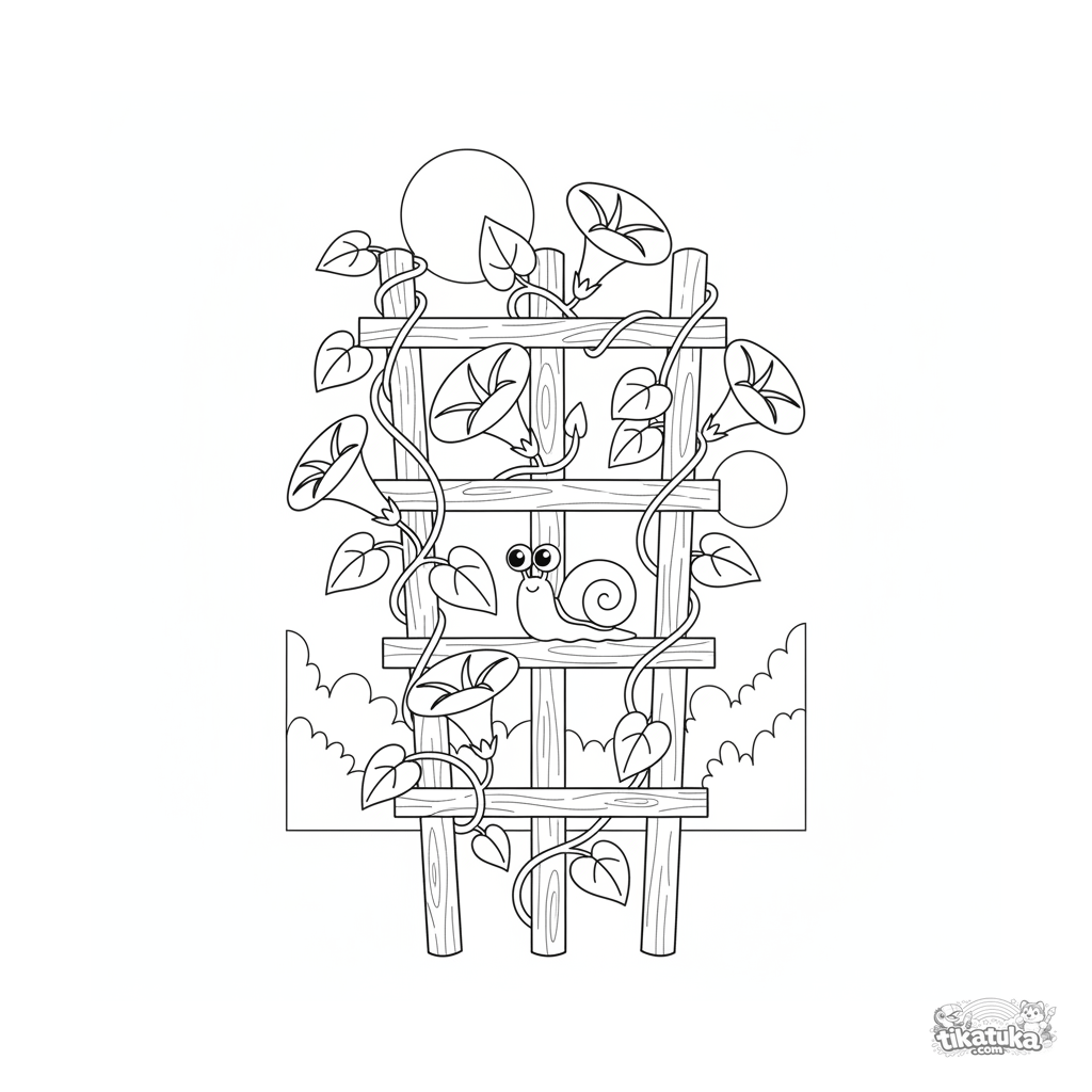 Ausmalbild für Kinder 4-6: eine blühende Prunkwinde rankt an einem Gartenspalier mit einer Schnecke. Klare Silhouetten, Paper-Cut-Stil.