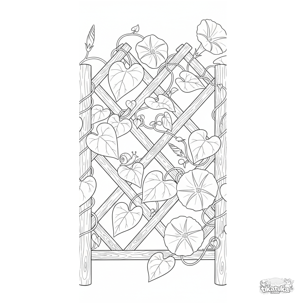 Komplexes Ausmalbild für Kinder 10-12: Eine detaillierte Prunkwinden-Ranke am Gitter mit einer Schnecke. Viele Texturen und Naturelemente.