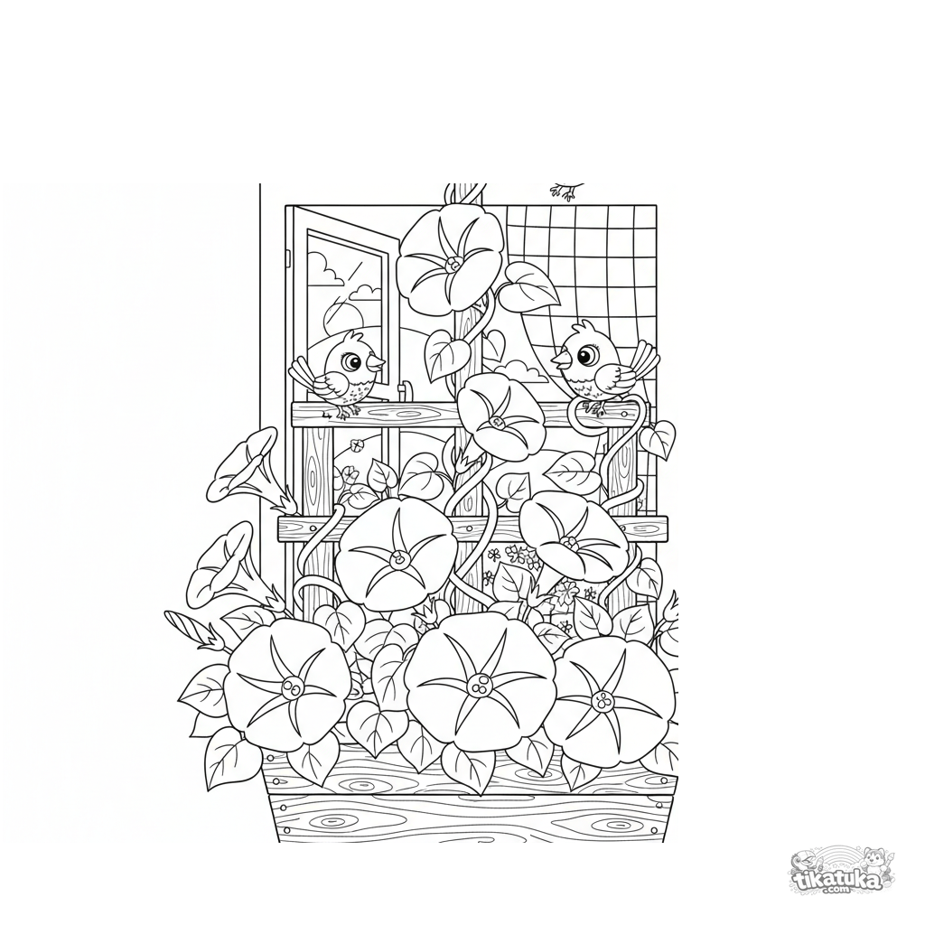 Ausmalbild für Kinder 4-6: Prunkwinden klettern an einem Gitter aus einem Blumenkasten unter einem Fenster. Gemütliche Szene.