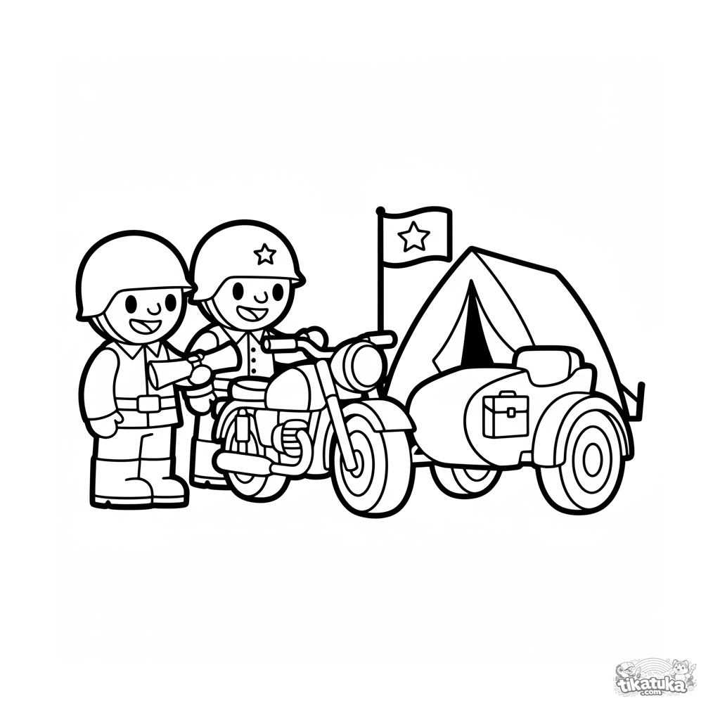Kleinkind-Ausmalbild 2-3: Ein einfaches Armee-Motorrad mit Beiwagen an einem Hauptquartierzelt. Ein behelmter Melder übergibt Dokumente an einen Offizier. Große, einfache Formen.