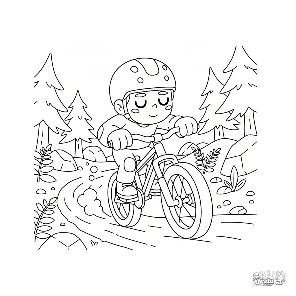 Ausmalbild für Kinder: Ein Mountainbiker rast einen Waldpfad hinunter. Für 4-6 Jahre, eine aufregende Szene voller Geschwindigkeit und Natur.