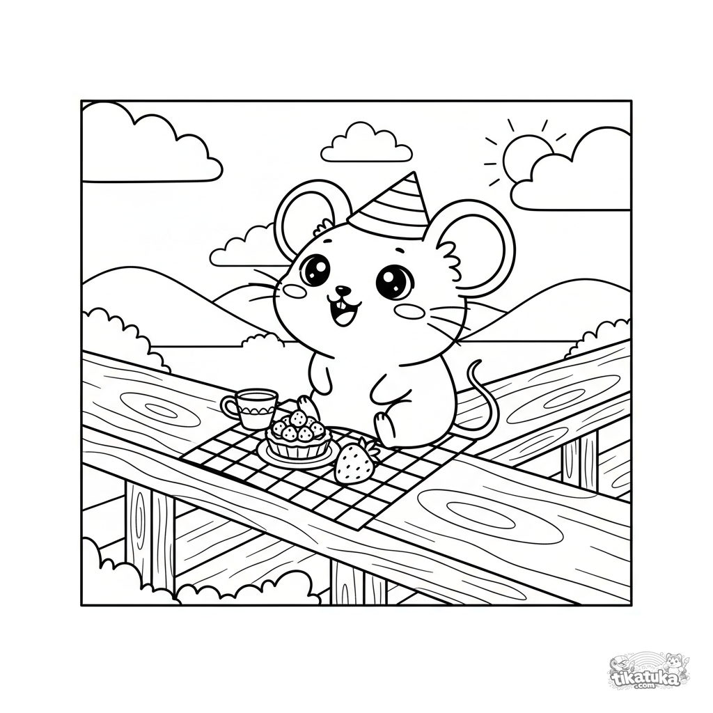 Ausmalbild für Tweens 7-9: Eine winzige Maus mit Hut picknickt auf einem Datscha-Verandageländer mit einer Beerentarte.