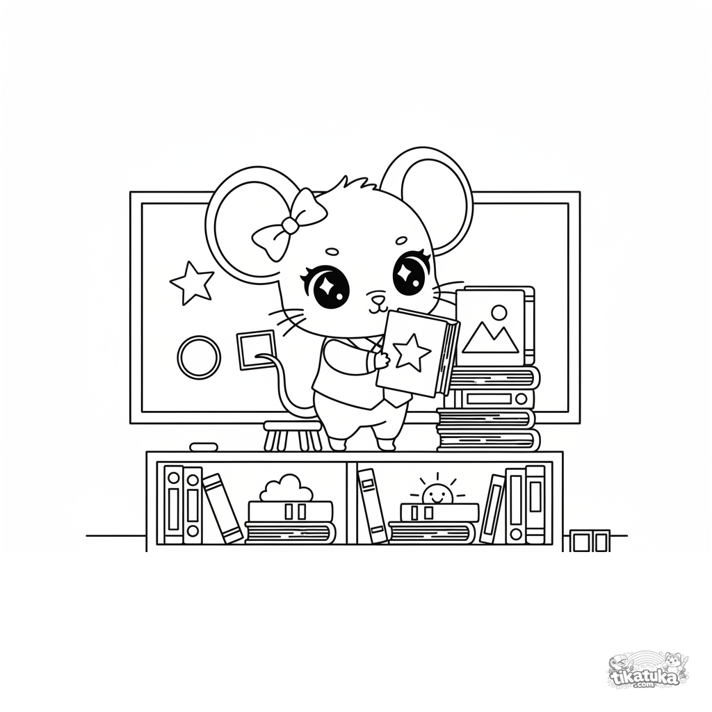 Ausmalbild für Kinder 7-9: Eine Maus-Bibliothekarin in einer Weste ordnet Bücher in einem Regal im Klassenzimmer an der Tafel.