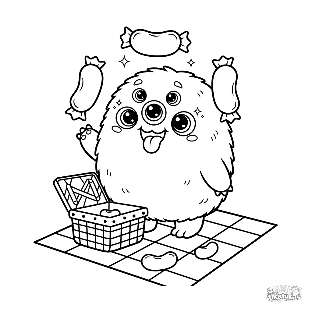 Ausmalbild für Kinder 7-9: Ein flauschiges, vieläugiges Chibi-Monster jongliert mit Gummibärchen auf einem Picknick.