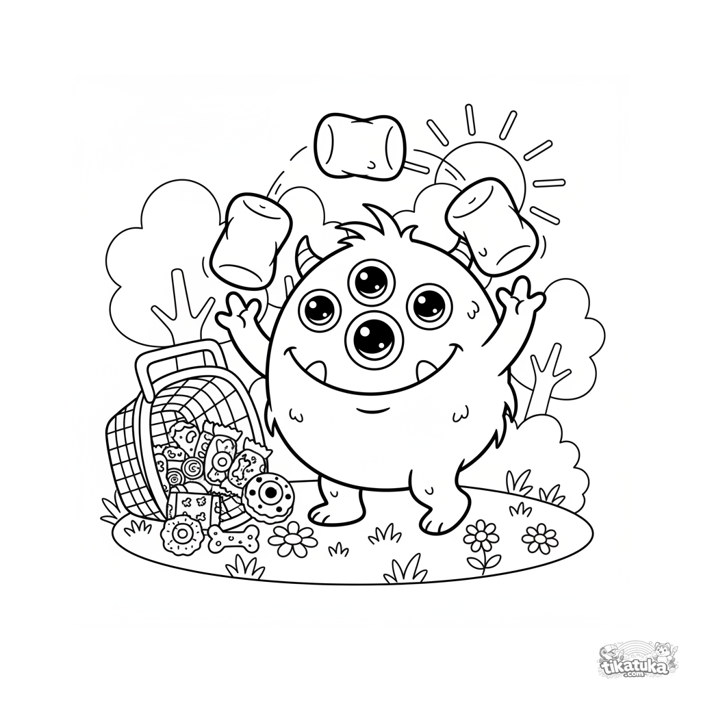 Ausmalbild eines glücklichen Multi-Augen-Monsters, das Marshmallows jongliert. Für Kinder von 4-6 Jahren. Helle, dynamische Szene.