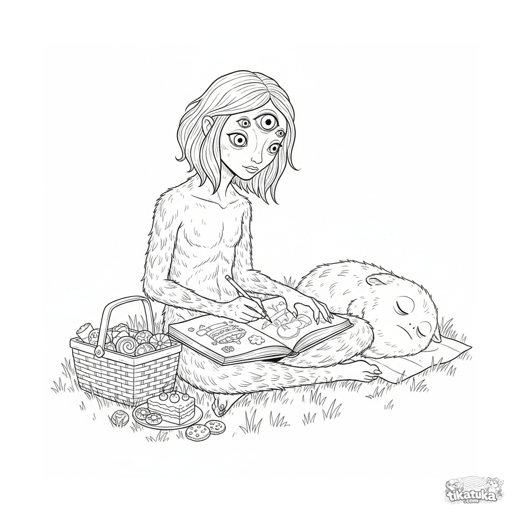 Detailliertes Ausmalbild für Kinder 10-12: ein realistisches, mehräugiges Monster zeichnet das Monster-Süßigkeiten-Picknick. Szene mit Felltextur und künstlerischen Details.