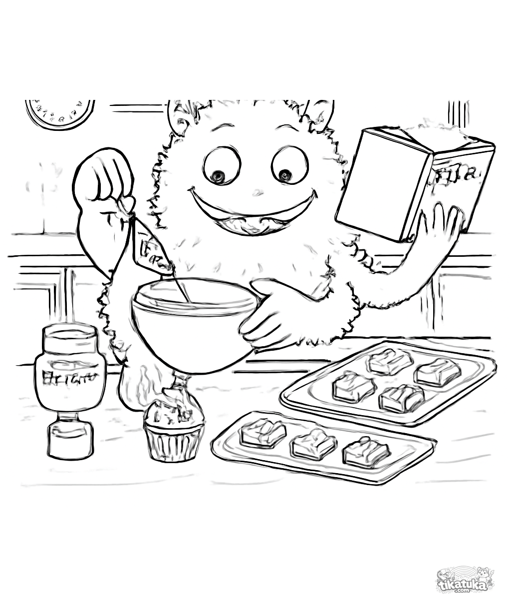 Schwieriges, detailliertes Ausmalbild eines vielarmigen Monsters, das in einer gemütlichen Küche Cupcakes backt. Für 8-12 Jahre.