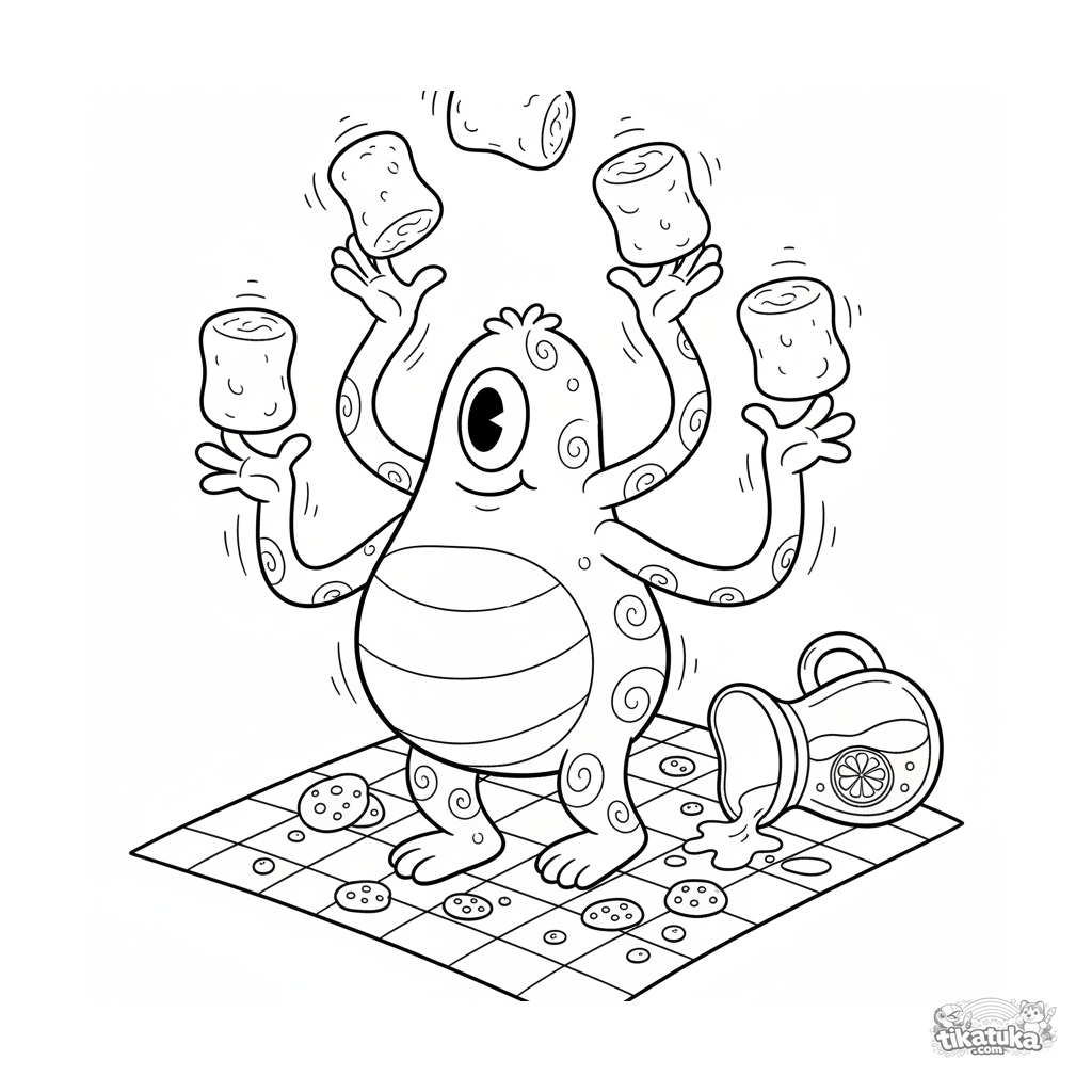 Detailliertes Ausmalbild für Kinder 10-12: Ein vierarmiges Monster jongliert mit Marshmallows beim Picknick. Dynamische, lustige Szene mit vielen Details.