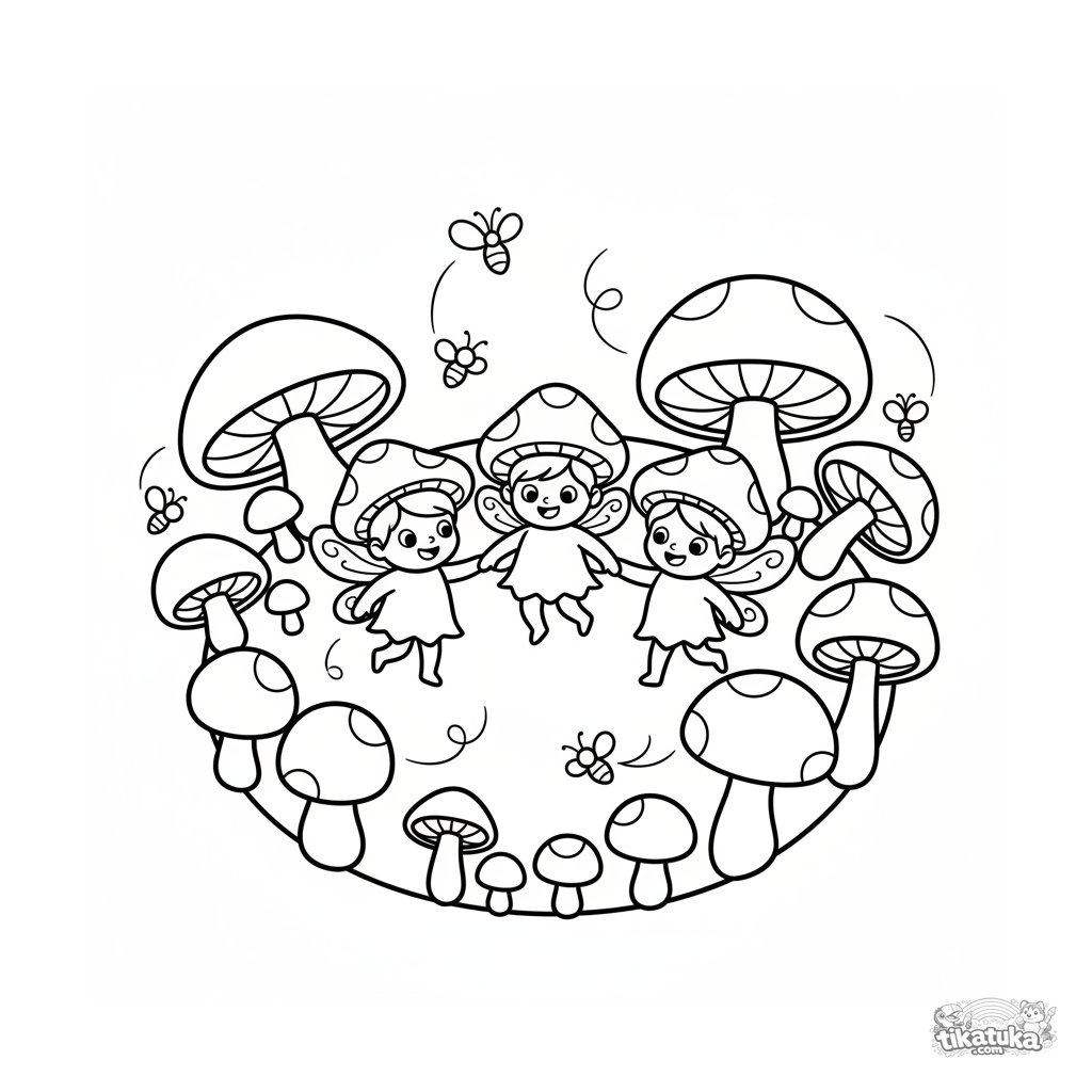 Einfaches Kleinkind-Ausmalbild 2-3: Drei Feen tanzen im Kreis in einem Ring aus Riesenpilzen. Große, klare Silhouetten im Paper-Cut-Stil.