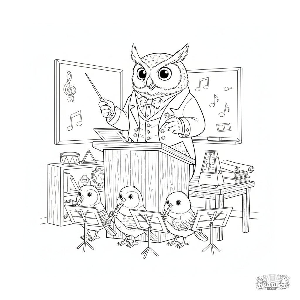 Ausmalbild für ältere Kinder 10-12: Ein Eulen-Musiklehrer dirigiert im Klassenzimmer ein Ensemble von Vögeln, die Blockflöten spielen. Notenständer, Metronom.
