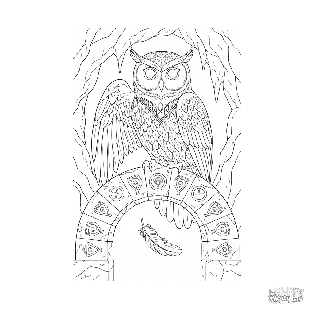 Detailliertes Ausmalbild für Kinder 10-12: Ein mythischer Eulen-Göttin-Wächter thront auf einem Steinbogen in der Gorgonenhöhle. Naturalistischer Feldführer-Stil, detailliertes Gefieder.