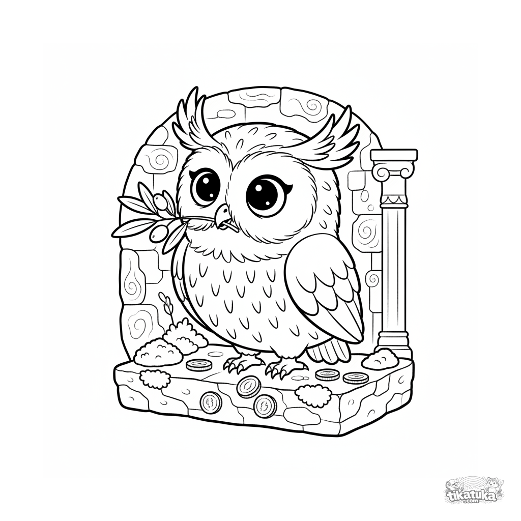 Ausmalbild für Kinder 4-6: Eine weise mythische Eule mit einem Olivenzweig sitzt auf einem steinernen Vorsprung in der Gorgonenhöhle. Eine helle und klare Szene.