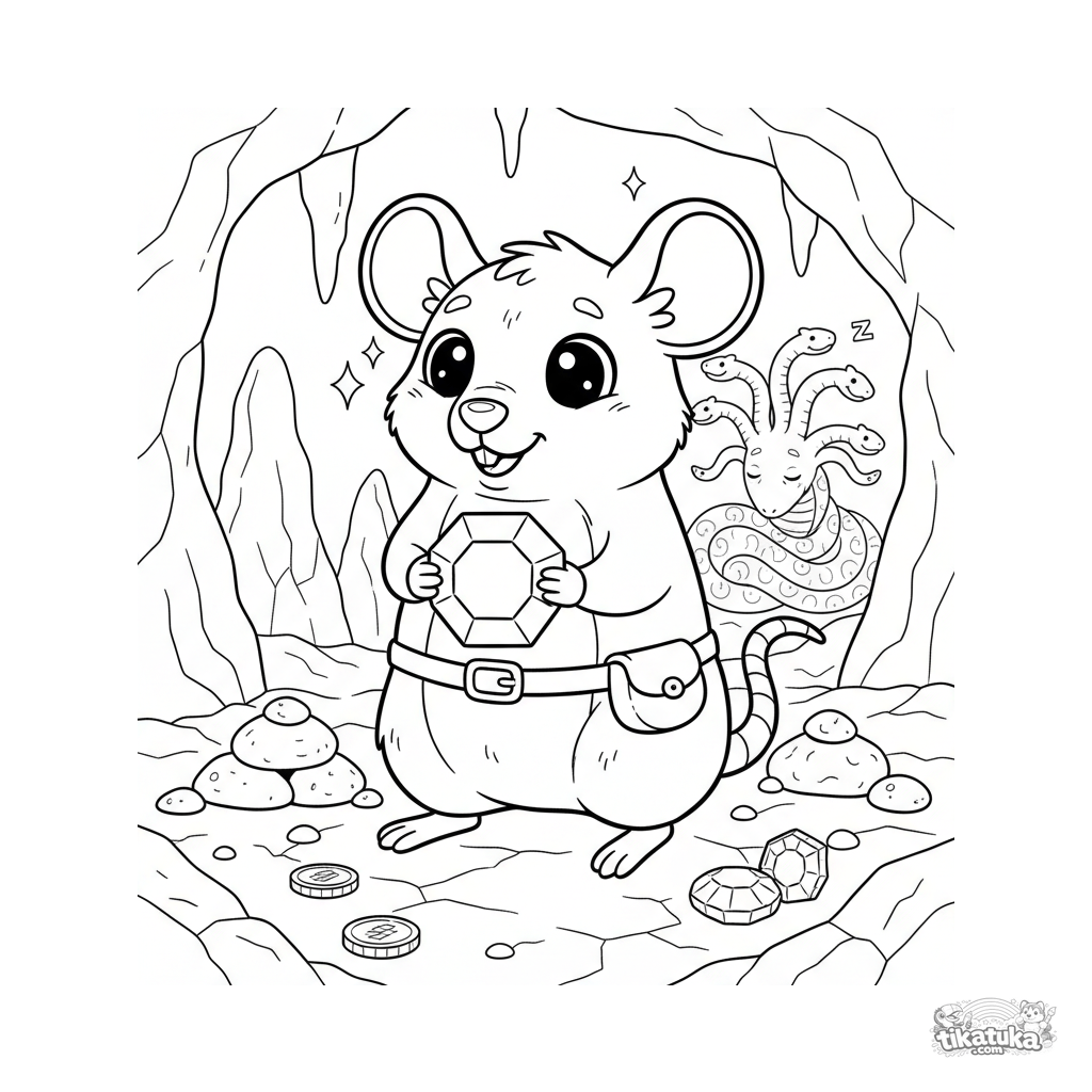 Ausmalbild für Kinder von 4-6 Jahren: eine süße mythische Ratte findet einen Edelstein in der Gorgonenhöhle.