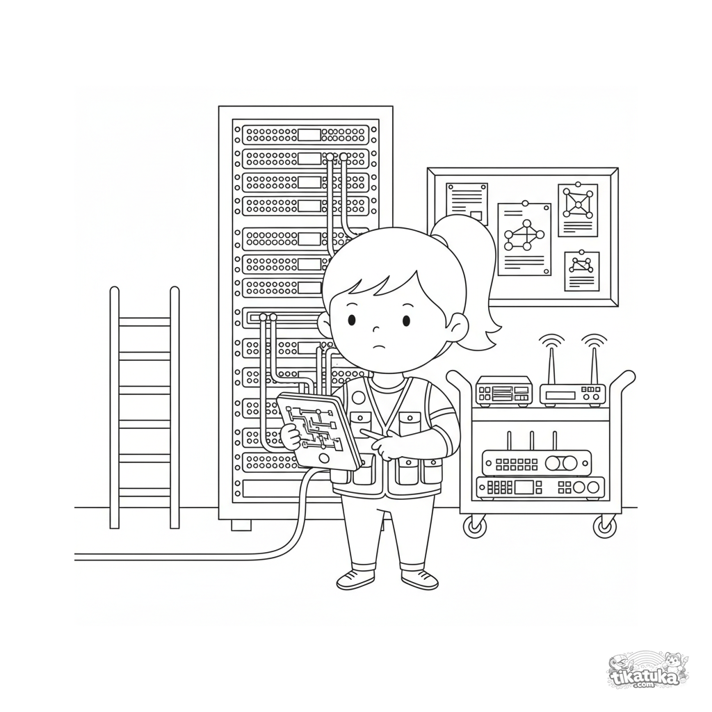 Ausmalbild für 10-12 Jahre: Ein Netzwerk-Admin behebt eine Störung an einem blinkenden Server-Rack im Keller. Details: Diagnose-Tablet, blinkende Lichter, Netzwerkdiagramme, Leiter.
