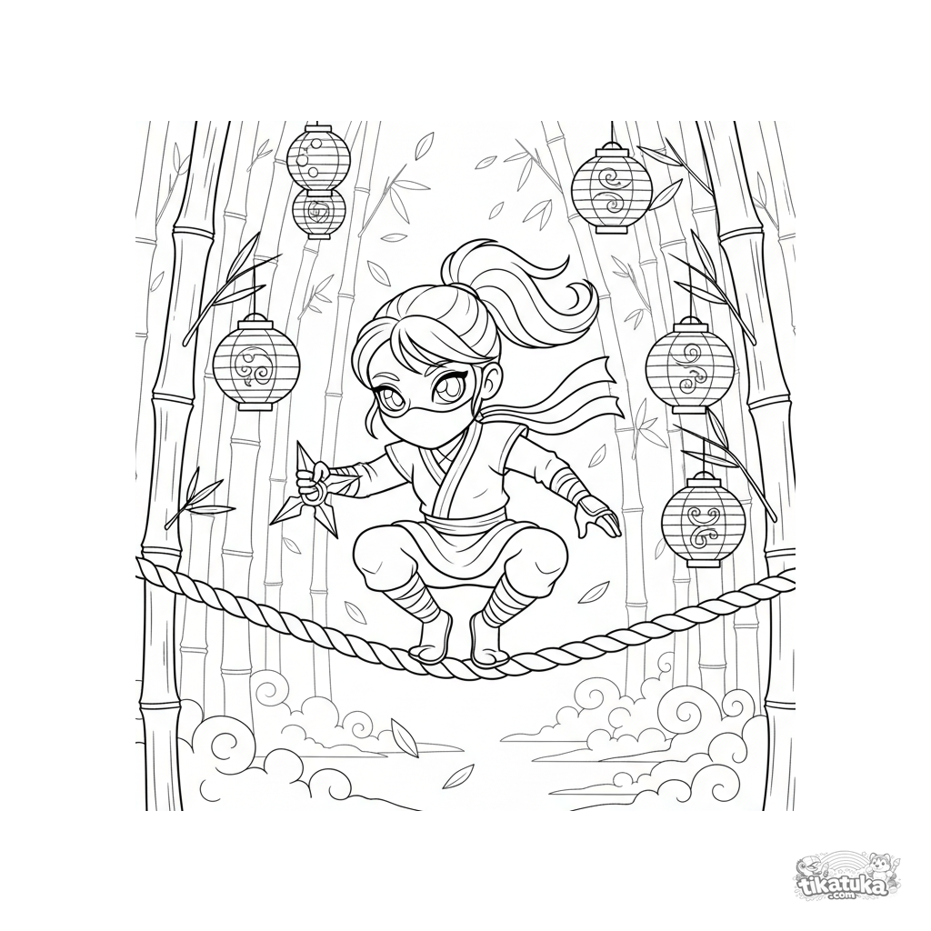 Detailliertes Anime-Ausmalbild: Ein Ninja-Lehrling bewältigt einen Seilparcours in einem nebligen Bambuswald. Atmosphärische Szene für Kinder 10-12.