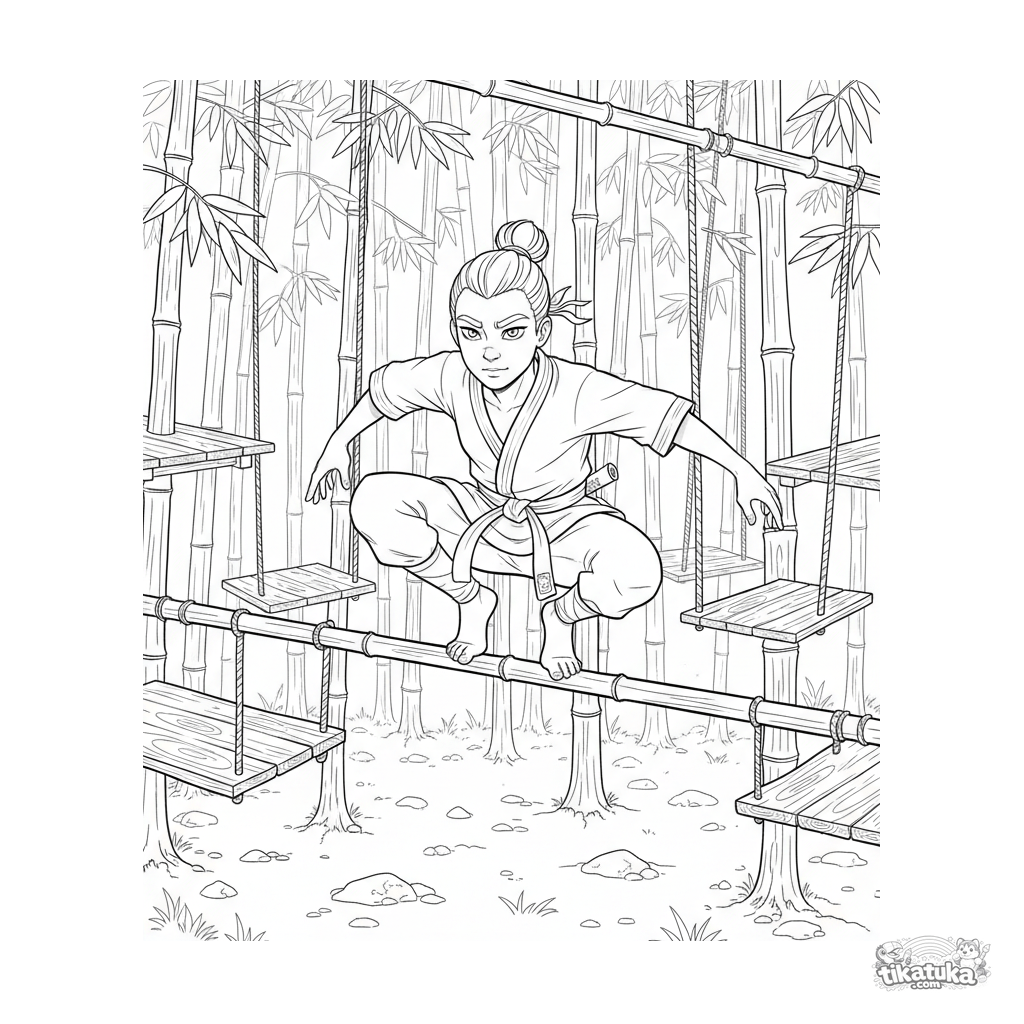 Detailliertes Anime-Ausmalbild für 10-12 Jahre: Ein Ninja-Lehrling demonstriert Geschicklichkeit, balancierend auf einer Stange in einem anspruchsvollen Hindernisparcours in einem Bambushain.