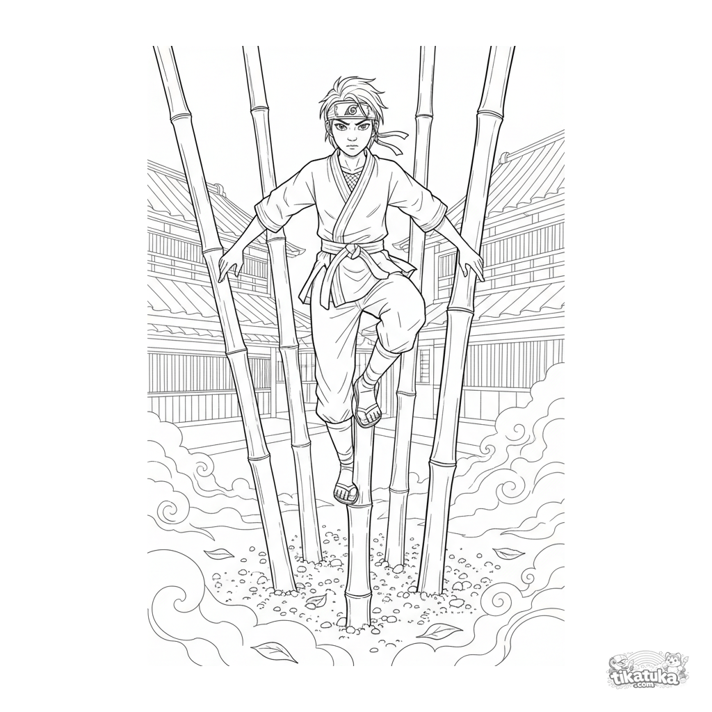 Detailliertes Anime-Ausmalbild: ein Ninja-Lehrling übt das Gleichgewicht auf hohen Bambusstangen in einem traditionellen Trainingshof. Komplexe Szene mit Architektur und Atmosphäre für 10-12 Jahre.