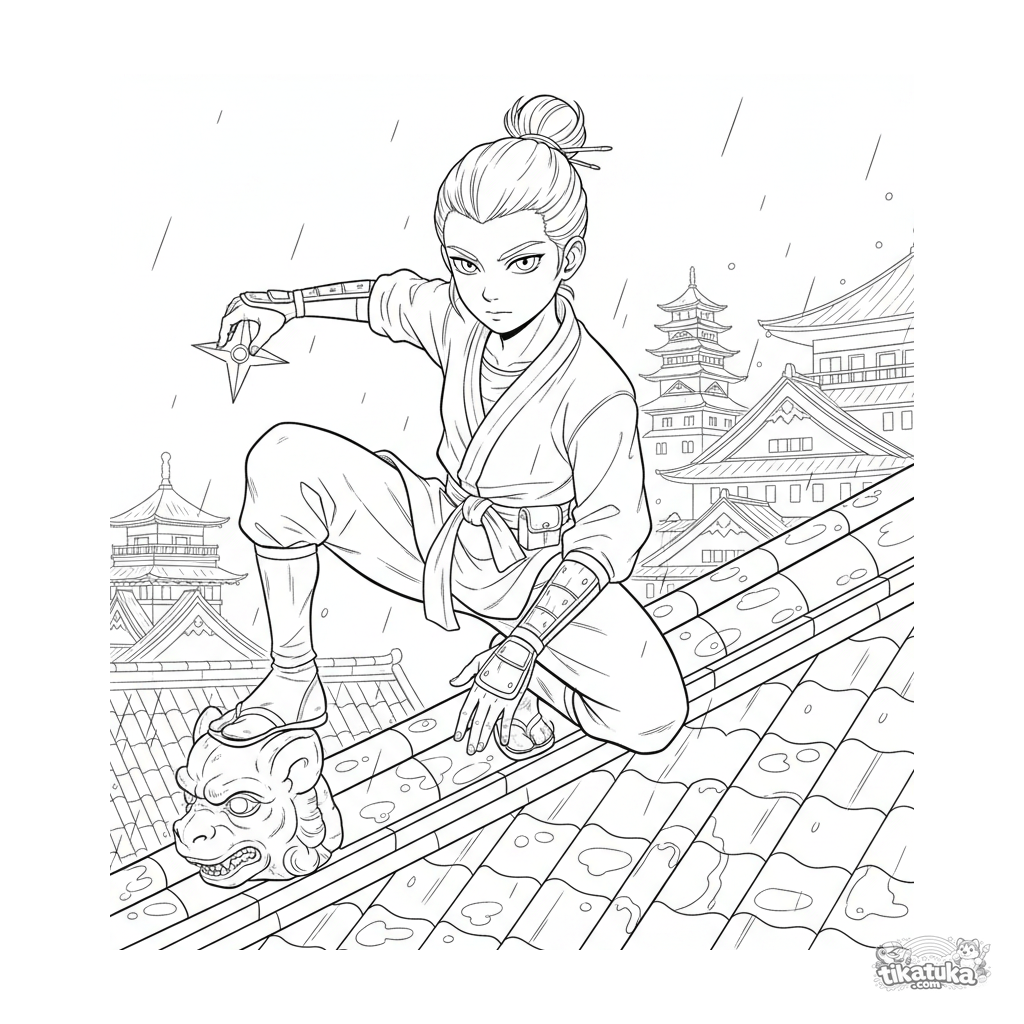 Komplexes Manga-Action-Ausmalbild: Ein Ninja-Lehrling übt das Gleichgewicht auf einem Schlossdach im Regen. Hochdetaillierte Szene mit Architektur und atmosphärischen Effekten für 10-12 Jahre.