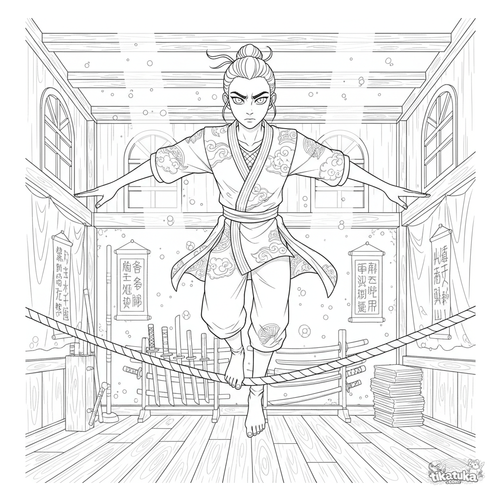 Detailliertes Anime-Ausmalbild: Ein Ninja-Lehrling balanciert auf einem Seil in einer traditionellen Trainingshalle. Für 10-12 Jahre mit komplexem Hintergrund.