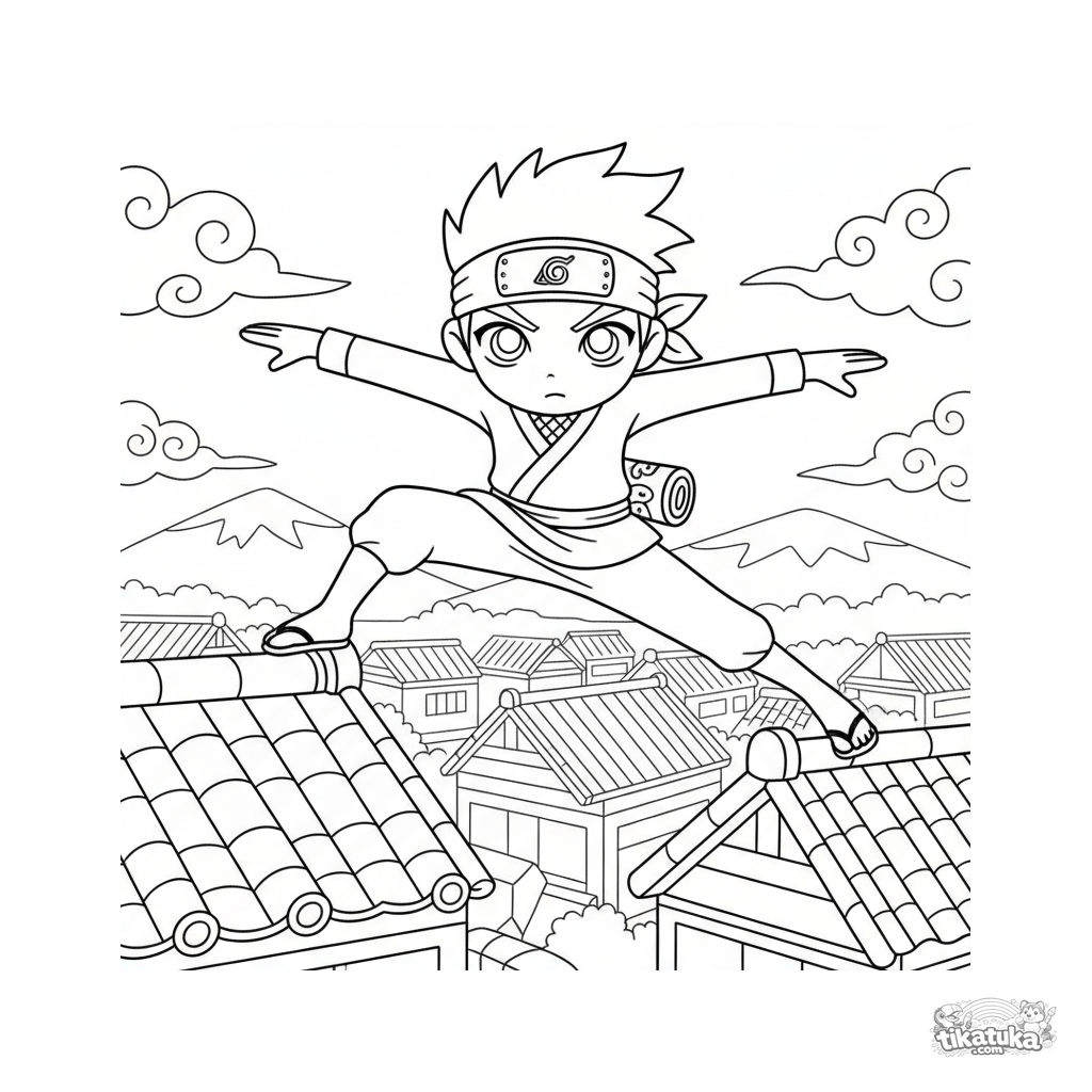 Dynamisches Anime-Ausmalbild für 10-12 Jahre: ein Ninja-Lehrling springt zwischen Ziegeldächern während eines Parkour-Trainings in einem traditionellen Dorf bei Sonnenuntergang.