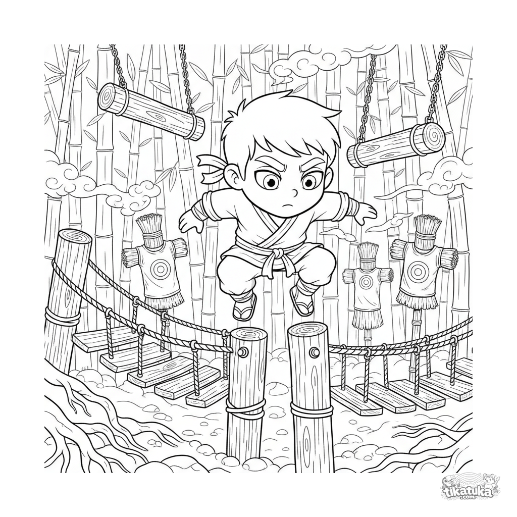 Dynamisches Manga-Action-Ausmalbild: Ein Ninja-Schüler trainiert im Wald-Parcours. Komplexe Komposition mit Bambushain für 10-12-Jährige.