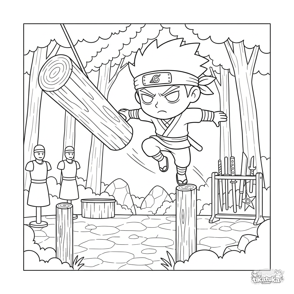 Dynamisches Shonen-Anime-Ausmalbild für 10-12 Jahre: ein Ninja-Lehrling springt durch einen Hindernisparcours in einem Wald-Dojo, umgeben von Trainingspuppen.