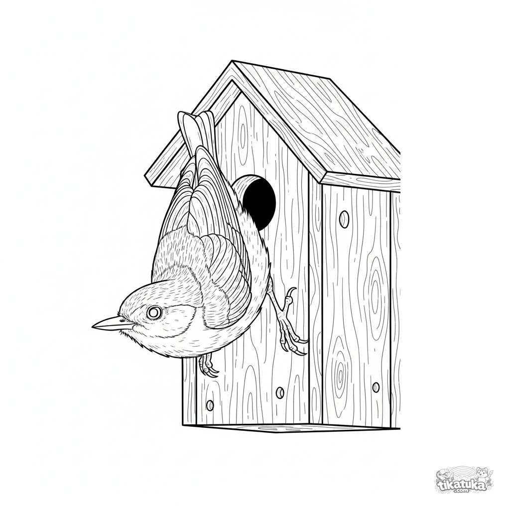 Komplexes Ausmalbild für Kinder 10-12: ein Kleiber vollführt eine akrobatische Leistung, indem er kopfüber an der Seite eines Holz-Vogelhauses hängt und nach Insekten sucht.