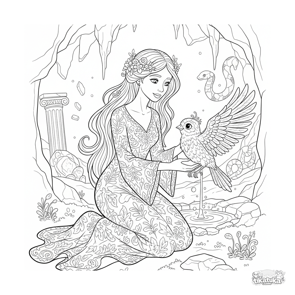 Komplexes Ausmalbild im Jugendstil für Kinder 10-12: Eine Nymphe an einer Quelle in der Gorgonenhöhle heilt einen versteinerten Vogel. Elegante, fließende Linien, detaillierte Darstellung.