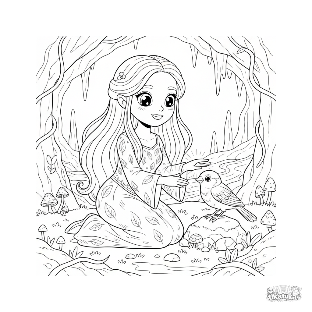 Ausmalbild für Kinder 7-9: eine freundliche Nymphe versucht, einen versteinerten Vogel in Medusas Höhle zu heilen. Art-Nouveau-inspirierte Szene.